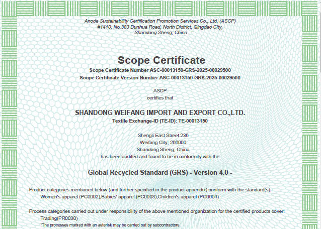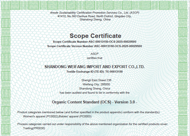 公司自營和代理服裝、食品、五金、化工、機(jī)電等各類商品及技術(shù)的進(jìn)出口業(yè)務(wù),公司有專門的生產(chǎn)、加工基地,并通過了Oeko - Tex Standard 100、GRS、OCS、RCS、USCTP等多項認(rèn)證,可以按客戶要求設(shè)計生產(chǎn),同時承辦中外合資經(jīng)營、合作生產(chǎn)、開展“三來一補(bǔ)”以及技術(shù)輸出、易貨、邊境貿(mào)易等業(yè)務(wù)。公司產(chǎn)品出口到日本、法國、俄羅斯等50多個國家或地區(qū)。